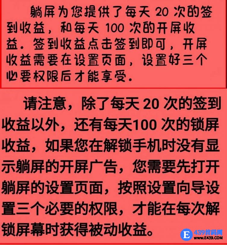 躺屏,锁屏赚钱,测试了下收益还可以,不用刻意去看广告,每天正常使用手机能有个2-3元,首次1元起提,后续5元起提。
