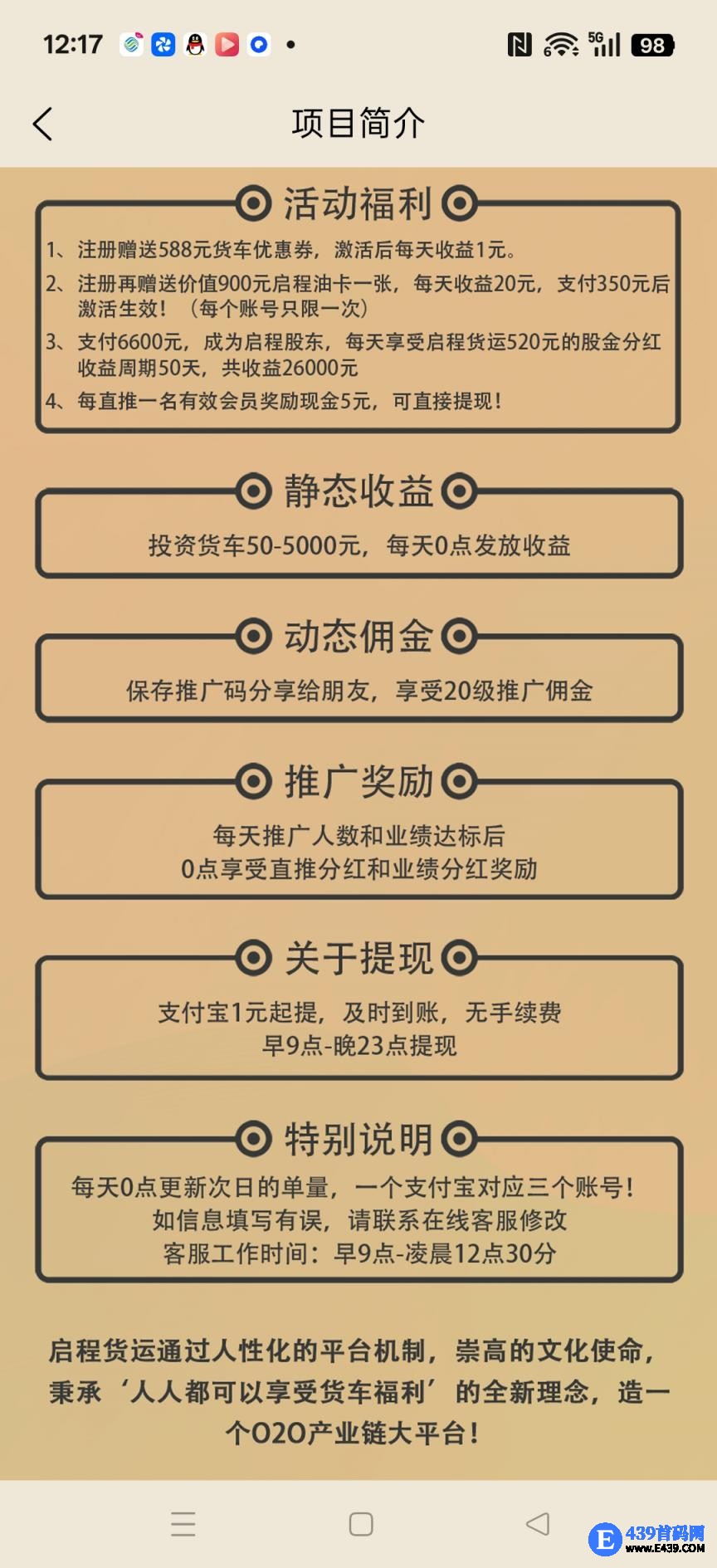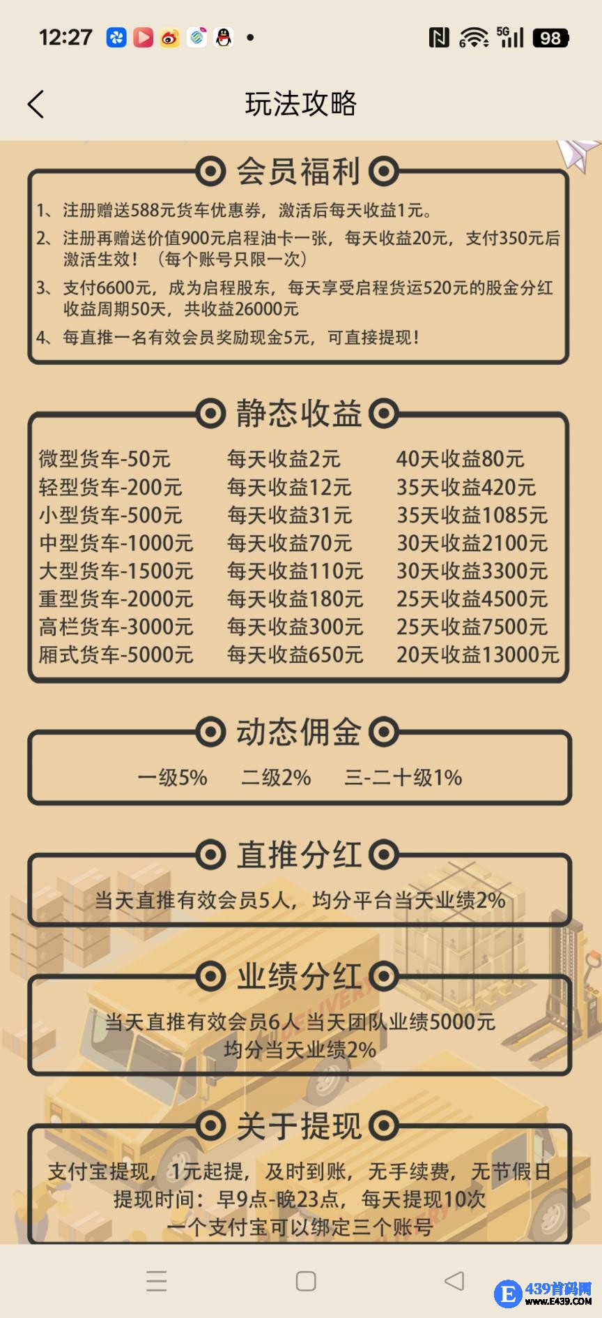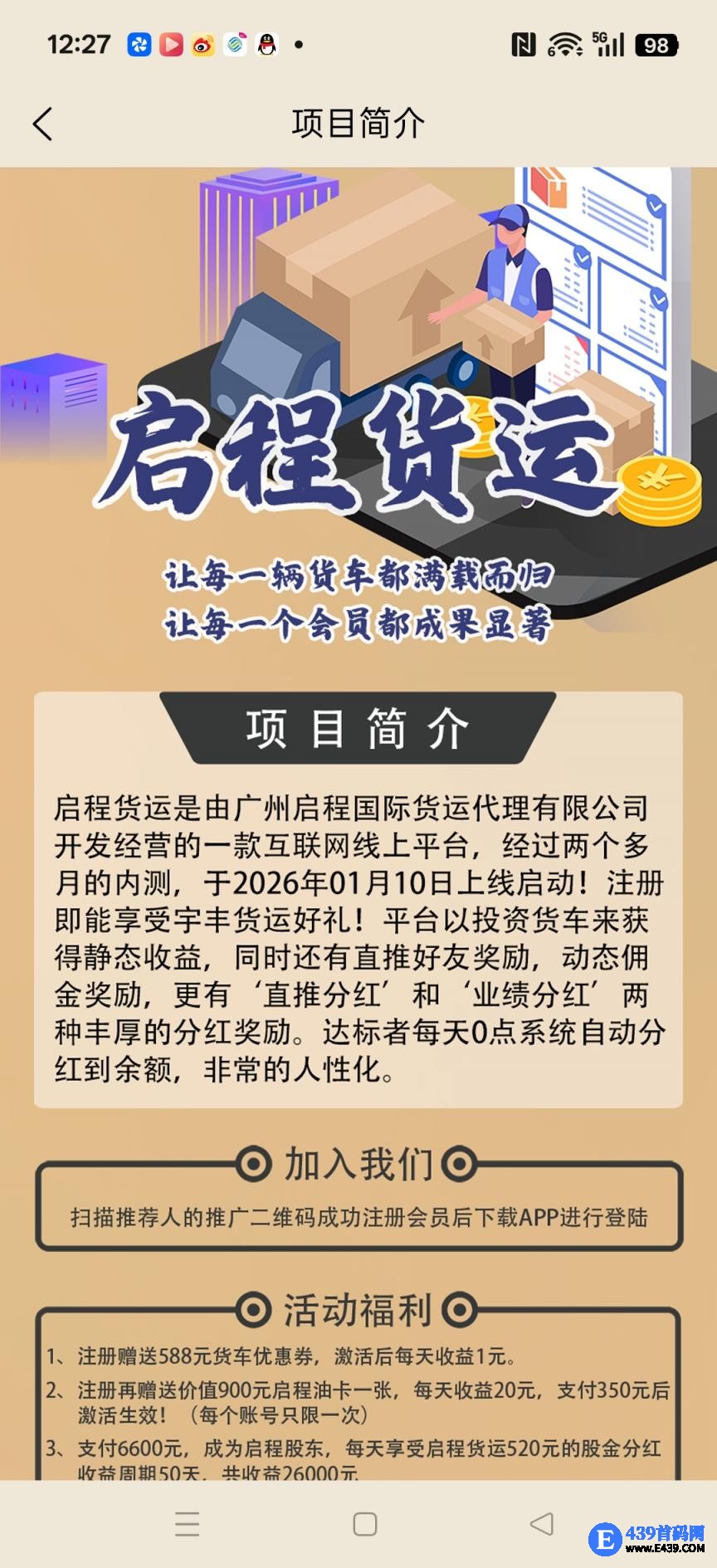 启程货运,卦机零撸保底收益高,注册奖励588,激活后每天收益1米,团队模式,邀请日入百米,
