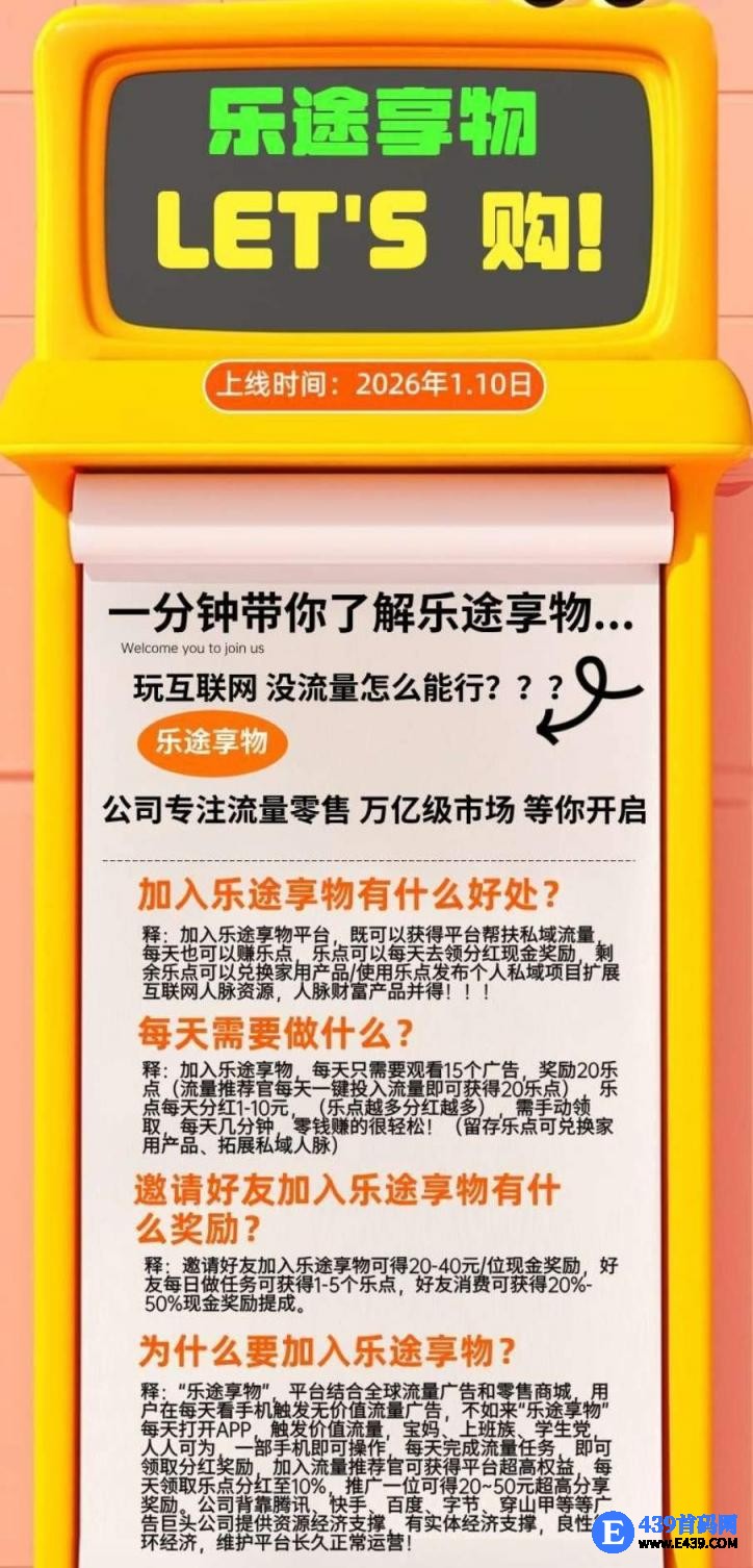立即登录乐途享物,零撸广告赚,保底收益高,不养机,拉新奖励,邀请日入百米,每日开流量零售机得20乐点、看15个广告得25乐点,推荐好友还能拿25-50米奖励,好友做任务你也能赚乐点,乐点每日可参与芬洪。