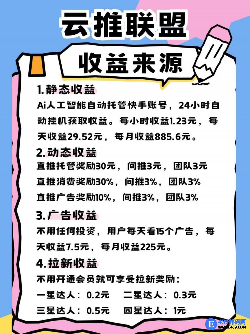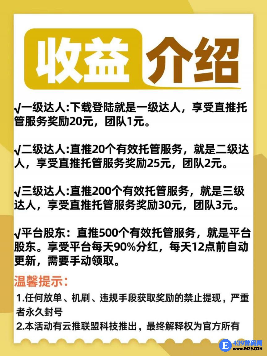 云推联盟零撸保底收益高、邀请日入百米,发布应用、看广告赚钱、拉新赚钱为一体的综合性服务平台。