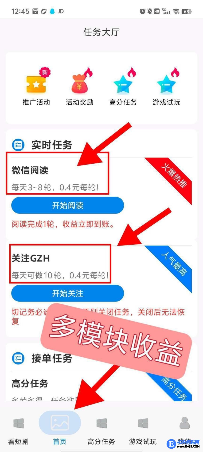 多重模块玩法,阅读赚,悬赏赚,试玩赚,关注赚