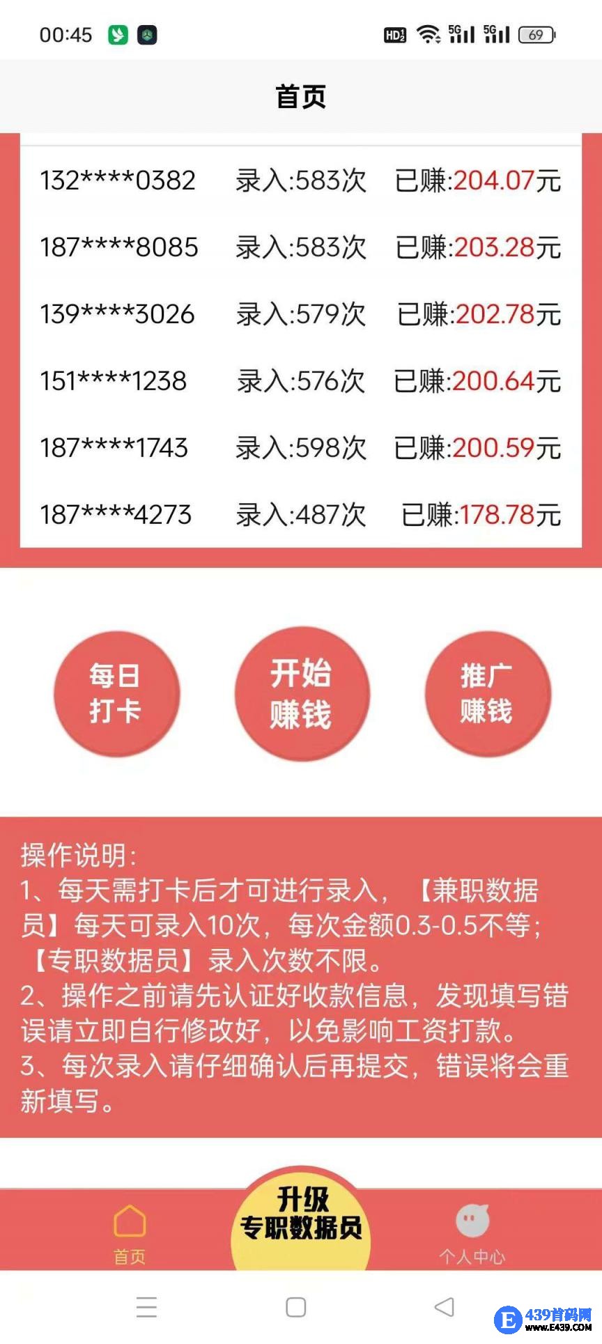 立即登录数据录,每天可录入10次,每次金额0.3-0.5不等;